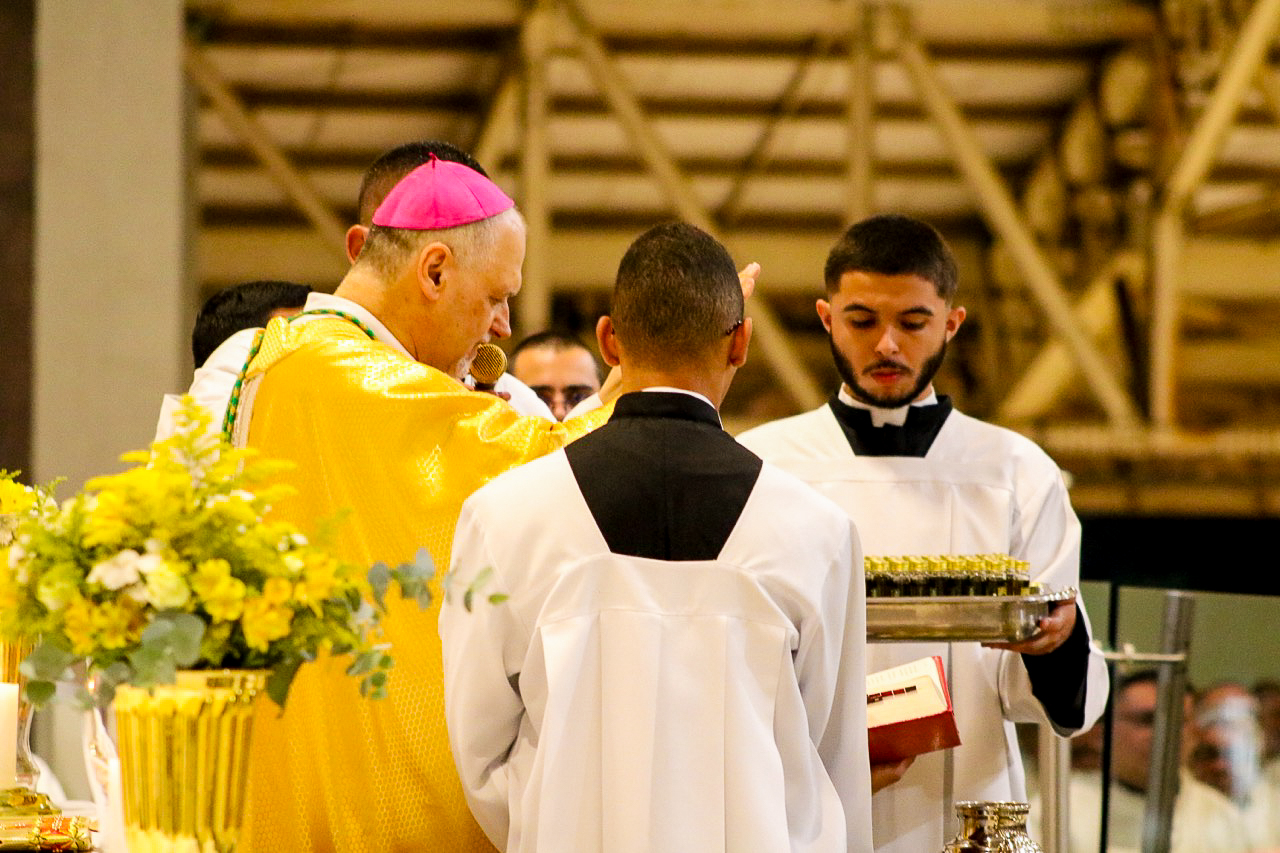 Um dos momentos mais fortes da celebração foi a bênção e consagração dos santos óleos, sinais sagrados da presença viva de Deus em nossa caminhada. O óleo dos catecúmenos fortalece aqueles que se preparam para a vida nova; o óleo dos enfermos leva consolo, cura e esperança aos que sofrem; e o Santo Crisma, consagrado de forma solene, marca para sempre aqueles que são ungidos, enviando-os à missão.